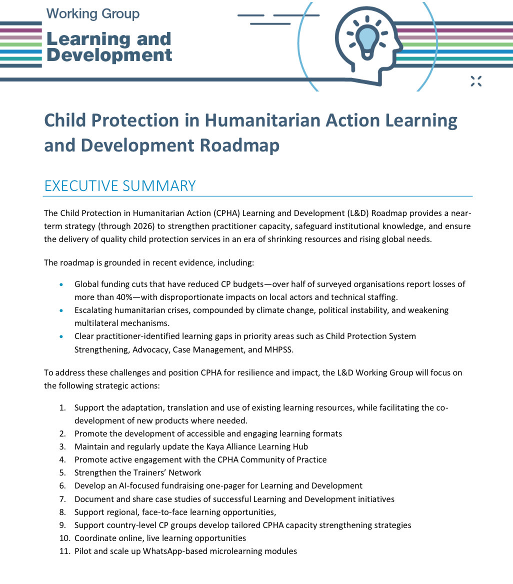 The Child Protection in Humanitarian Action (CPHA) Learning and Development (L&D) Roadmap provides a near-term strategy (through 2026) to strengthen practitioner capacity, safeguard institutional...