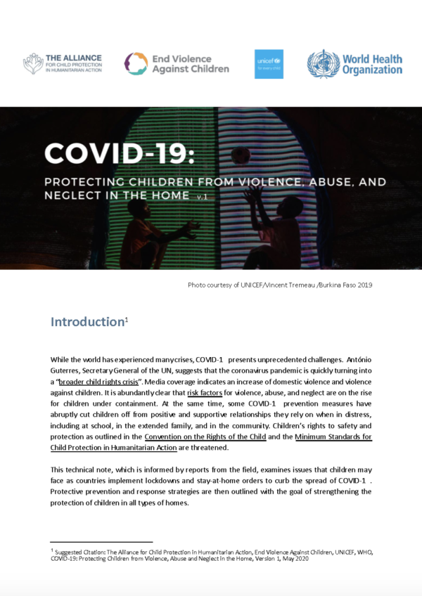 Cette note, qui se base sur des rapports de terrain, examine les problèmes auxquels les enfants peuvent être confrontés alors que les pays mettent en œuvre des verrouillages et des ordonnances de maintien à la maison pour freiner la propagation du COVID-19. Des stratégies de prévention et de réponse protectrices sont ensuite décrites dans le but de renforcer la protection des enfants dans tout type de foyers.